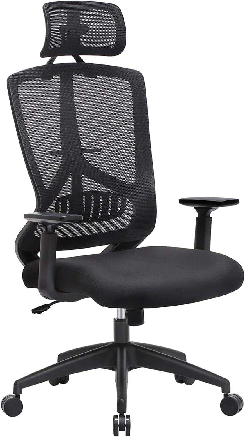 SONGMICS kontorstol, m. lændestøtte, nakkestøtte, armlæn, vippefunktion, højdejustering – sort mesh